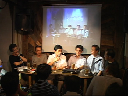 ネイキッドでの「オウムって何?」のイベント。左から、平野悠、野田成人(元オウム幹部)、上祐史浩(光の輪代表)、広末晃敏(光の輪副代表)鈴木邦男(思想家)、岩本太郎(ライター)の面々が熱い議論を交わした