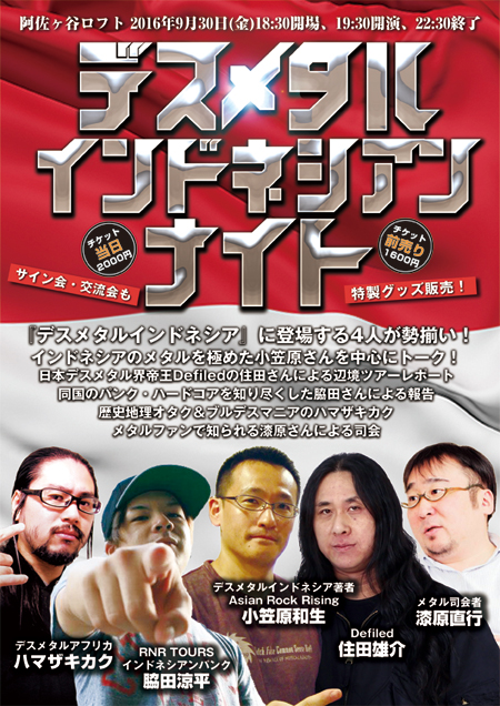 出演するのは、『デスメタルインドネシア』の著者でAsian Rock Risingの小笠原和生さん。ネパールや雲南省、モンゴルなど色んな辺境でライブをされてきた経験があり、インドネシアのライブレポートも寄稿されたDefiledの住田雄介さん。RNR TOURSを主催され、インドネシアのハードコアパンクシーンに対する造詣が深く、実際に『デスメタルインドネシア』のハードコアでお勧めの音源を寄稿して下さった脇田涼平さん。『デスメタルアフリカ』の著者で『デスメタルインドネシア』の編集者、そしてインドネシアだけでなく全世界のブルータルデスメタルや歴史・地理に詳しいハマザキカク。