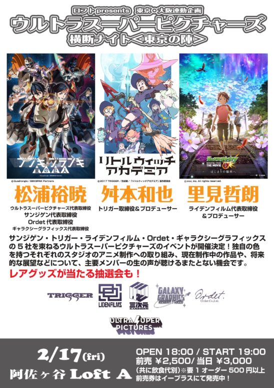 サンジゲン・トリガー・ライデンフィルム・Ordet・ギャラクシーグラフィックスの5社を束ねるウルトラスーパーピクチャーズのイベントが開催決定!数多くのアニメイベントを開催している阿佐ヶ谷ロフトA(東京・阿佐ヶ谷)/ロフトプラスワンWEST(大阪・日本橋)の2箇所にて実施いたします。