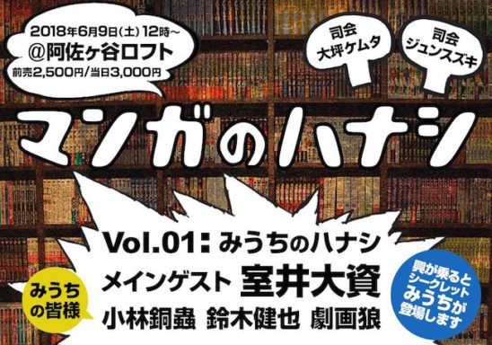一緒にご登壇頂くみうちの面々は、『めしにしましょう』の小林銅蟲先生!&『おしえて!ギャル子ちゃん』の鈴木健也先生!&『エクストリームマンガ学園』の劇画狼氏!更に観客の盛り上がりによっては、シークレットみうちのあの人も登壇するかも知れません…!