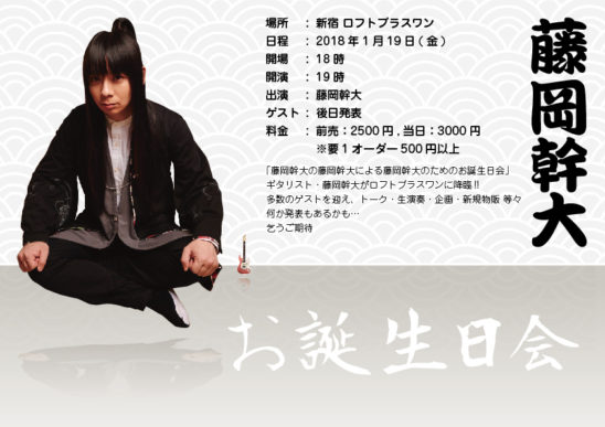 藤岡幹大の誕生日であります1月19日にロフトプラスワンで予定されていましたこちらのイベントでしたが、外部委託していましたイベント主催者、石田淳司による重大な不手際が発覚した事により、