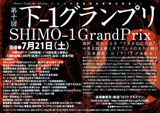 毎年07月21日に《誰が一番エロいのか!?》という人類史上最も低俗な王座を賭けて闘い続ける奇跡の下ネタコンペティション『下ー1グランプリ』。