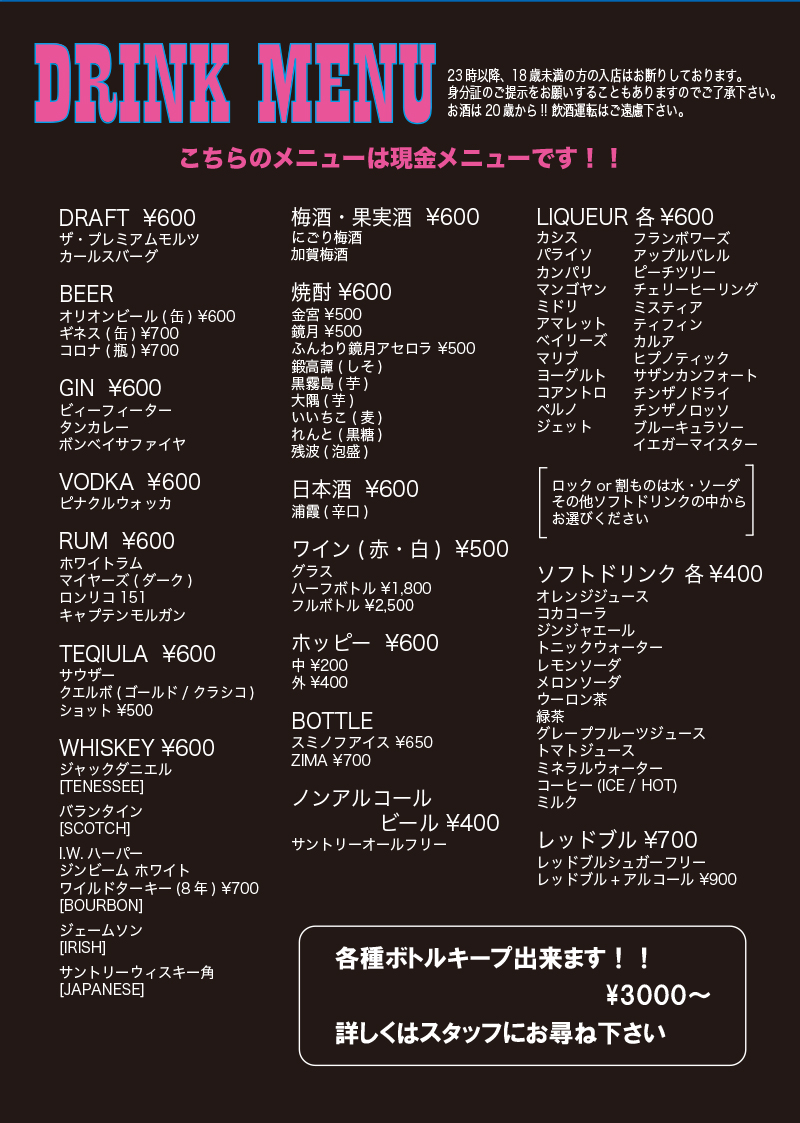 23時以降、18歳未満の方の入店はお断りさせて頂いております。 身分証のご提示をお願いすることもありますのでご了承下さい。 飲酒運転は法律で禁じられています。お車でお越しの方の飲酒はご遠慮下さい。