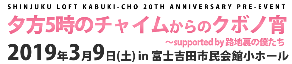 「夕方5時のチャイムからのクボノ宵〜supported by 路地裏の僕たち」公演ですが、2016年新宿ロフトから始まった、メレンゲ Vo&G クボケンジ氏によるソロワンマン「クボノ宵」公演の出張編となります。彼の親友であるフジファブリック Vo&G 志村正彦氏の故郷である山梨県富士吉田市で来春、歌舞伎町移転20年目を迎える新宿ロフトのアニバーサリー公演の一環として開催致します。