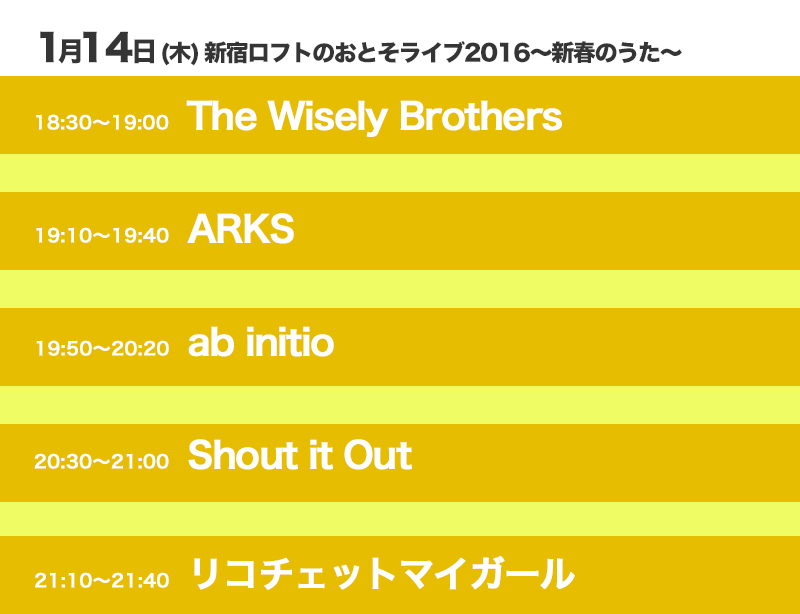 ab initio/ARSK/Shout it Out/リコチェットマイガール/The Wisely Brothers