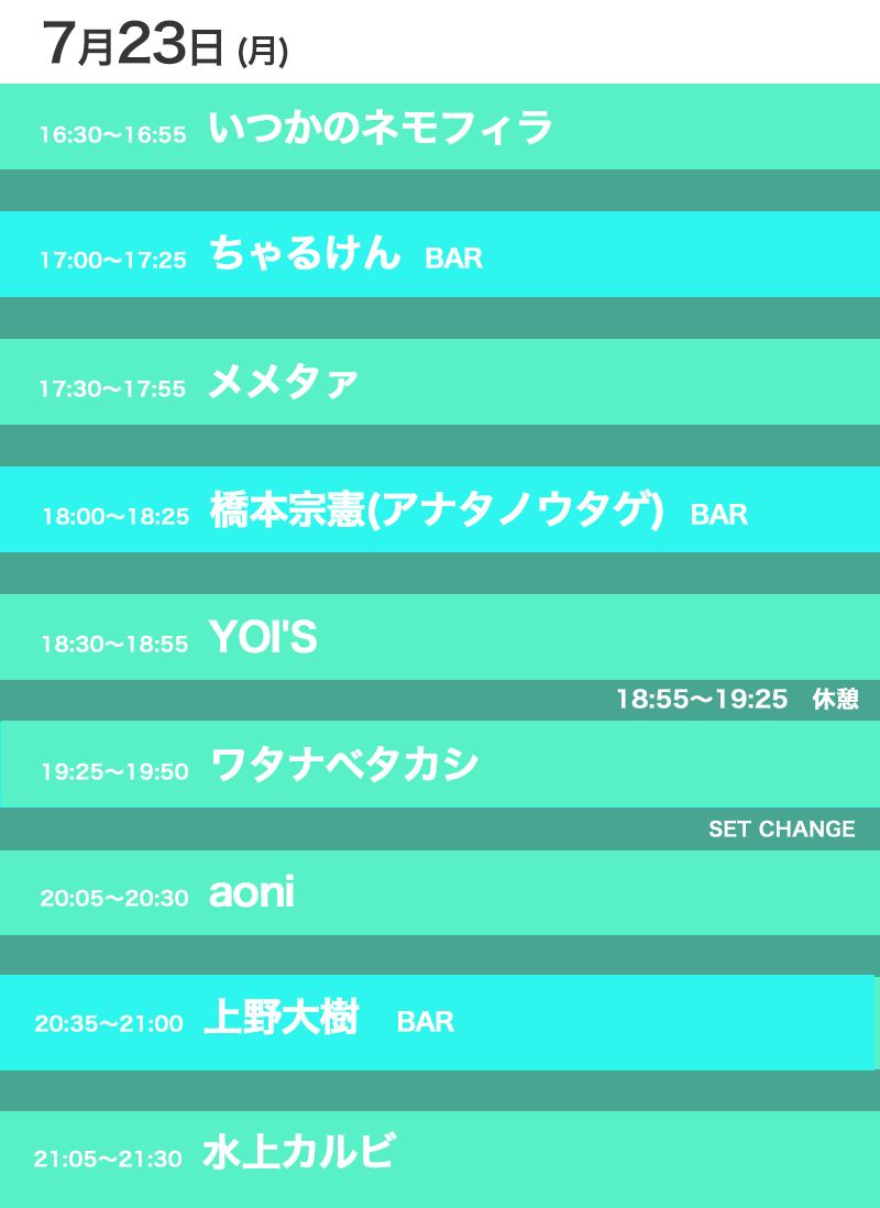 【出演】メメタァ、ちゃるけん、いつかのネモフィラ、橋本宗憲(アナタノウタゲ)、aoni、水上カルビ、ワタナベタカシ、YOI’S、上野大樹