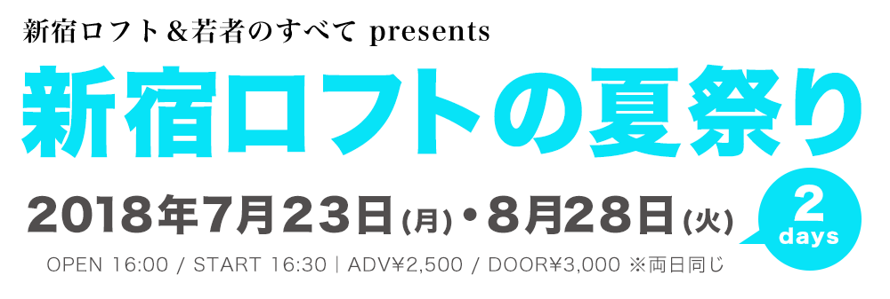 今年は大塚Deepaを中心にサーキットフェスを展開している「若者のすべて」の皆さんと一緒に恒例「新宿ロフトの夏祭り」を開催します。今年もホールステージとバーステージの2ステージの往来公演として2日間開催致します。