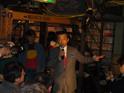 ▲プラスワンで客席と交流する浅野史郎都知事候補。とにかく石原都政を阻止するには彼に当選してもらうしかないのだが、果たして…… |