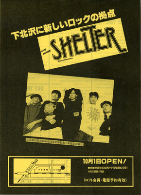 「下北沢に新たなロックの拠点が誕生した。その名も「SHELTER」。新宿ロフトの姉妹店だ。年々多様化する音楽状況と入場者の増大化に対する一つの答えがシェルターの役割で、今までロフトでは出来なかったジャンルや企画なども積極的に取り入れて行こうという考えだ。そんなわけで初日からの6日間の企画は早くも異色な顔ぶれになっている。1日のセッションは言うに及ばず、VENUS PETERや有山じゅんじと言ったミュージシャンの出演は、これまでのロフトの枠を打ち破る可能性に満ちていると言えるだろう。」(『Rooftop』1991年10月号より)
