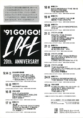 シェルターのオープン工事が続く中、一方ではロフトプロジェクト20周年記念事業が、1991年9月より新宿LOFT店長・小林茂明、シェルター店長・平野実生の下で慌ただしく始まっていた。同年10月がシェルターオープンだから、なんとも忙しく大変な作業だった。この20周年イベントは、9月14日の日比谷野外音楽堂から始まって、最終日9月25日の渋谷公会堂まで、全11日間のロングラン公演をやり遂げ、その熱気を、翌月10月1日のシェルターオープンにもちこむ作戦だった。