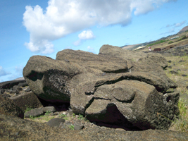 原付バイクででこぼこ道の牧場を抜けると、未完成モアイに遭遇する。初めて見る。いわゆる有名なモアイの形とは全然違う。ただの流石か? と思うぐらいだ。これら未完成がモアイの全部だったら、この島は観光地にはならなかっただろうと思った。(次号へ続く)
