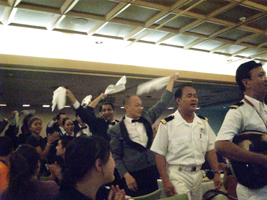 「僕は多分、夏前に外国勤務になるから無理だ」と、官僚予備軍のTが言った。ふと会話が途切れると、船員、従業員、ハウスキーパーの人たちが、ハンカチを振りながらレストラン内を音楽に合わせて行進し始めていた。全員が外国人だ。「今まで私たちのために働いてくれてありがとう」「さよなら、お元気で」と、乗客と船で働いている人との、お客、従業員の壁を取り払ったお別れ交流会だった。泣いている人もいる。