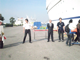 上陸・下船の時には必ずピースボートのえらいさんがゲートで笑顔で立ち会ってくれる。