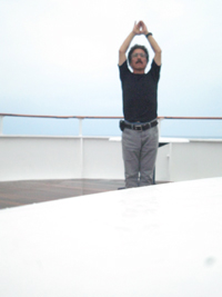 船でヨガ(太陽礼拝)を一人する平野さん。