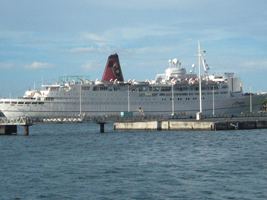 最後の寄港地、パラオ共和国・コロールに朝早く着岸。海は静かで、よく晴れている。1527年にポルトガル人に発見されたこの200程の島々も、いまや一つの独立国だ。人口約2万人。その昔は日本の信託統治領だった。今は悲しいかな軍事、防衛、国家財政のほとんどを援助するアメリカの属国みたいになっているという。スキューバダイビングのメッカらしく、高級ホテルもたくさんあるみたいだ。土産物屋も多い。観光客の大半は飛行機で来るのだろう。だが肝心の海や街はあまり綺麗ではない。シーズンオフで観光客は少ない。