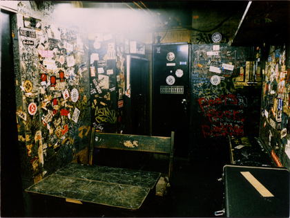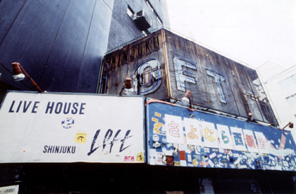 夜になると、バカでかい黄色と青の「LOFT」のネオンがさらに周辺を怪しくさせる。地下へ通じる階段の途中の踊り場で、無愛想な姉ちゃんの受付を済ませ、薄暗い階段から数々のチラシが置き場に並んだ地下に下りてゆくのは、ドキドキする瞬間でもあった。壁には何重にもロックの白黒ポスターが張り巡らされている。落書きだらけで汚い便所。市松模様の床。バカでかいスピーカー。店内は意外と狭い。入り口に周辺にたむろするパンクスを、勇気を出してかき分けて中へと進む。この怪しげな伝説の新宿LOFTの雰囲気に圧倒されて、ビビッてなかなか店内に入ることができなかったロフト初心者も多かったと聞く。
