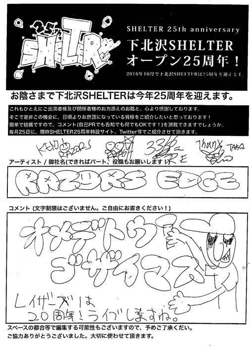 下北沢SHELTER25周年おめでとうございます! SHELTERは撃鉄で出させてもらった時、遊びに行った時、全て良いライブの思い出ばかりです!伝統の先の伝説へ! これからも良いバンド達をよろしくお願いします。