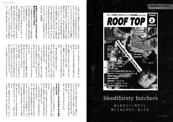 ロフトグループ発行のフリー・マガジン『Rooftop』に掲載されたブラッドサースティ・ブッチャーズのインタビュー15年分を網羅し、7年間にわたり連載されていたメンバーの持ち回りコラム『裏のスジの突き当り』を完全復刻、さらに本書でしか読めない特別インタビューまで収録した、「読むブッチャーズ」の決定版と言える一冊!