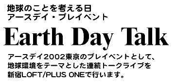 | 4月12日(金) 「21世紀の森林づくり」 すべての生命が宿る森林──21世紀の森林を守るために 私達は何をやっていけばよいのだろう? 【出演】羽鳥孝明(グループ浜仲間の会)、岡崎時春(国際環境NGO FoE Japan)、 A SEED JAPAN、稲木清貴(東京の木で家を造る会)、他 |