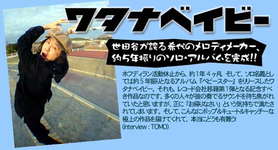 「今回の作品は、バンド・サウンドではないんですよね。自分一人で演ってるような曲が結構、ございまして。要するに、ギターの僕とベースの僕と、ヴォーカルの僕とコーラスの僕がプレイしてる訳じゃないですか。それで、“僕って良いバンドだなぁ”と(笑)。“タイム感とか呼吸がバッチリ合ってるなぁ、コイツら”っていうところが伝わればなぁと思いますね。ライヴは、サード・クラスと一緒なんですけど、以前のレパートリーも演っちゃおうかなと思ってるんですよね。だから割と、“ベスト・オブ・ワタナベイビー”というような選曲にするつもりなので、面