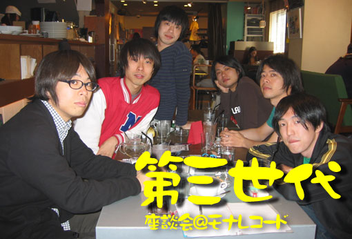 …というわけで、座談会を設けてもらい、どんな話が聞けるのかとワクワクしながら座談会が行われる下北沢のモナレコードに向かった。第三世代に所属もしくは所属予定(笑)のバンドから代表者が集まり、気付けば6名が参加していた。「バンドが主導となって動けるような団体。」とマスザワ氏が言っていただけに、意気込みがいつも以上にアツイことを伺わせた。 ―――まず、なぜ“第三世代”なのかを聞きたいのですが…。第一、第二は誰なのかと…。 増沢 単純に意味のない単語がいいねっていう話をしてたんですよ。だからと言って“下北ギターポップ”みたいなのじゃおもしろくないねって。もちろん下北ギターポップやギターロックみたいなところで考えてはいるんだけど、ギターロックって言ったらギターがいてロックじゃなきゃだめなのかって制限してしまうじゃないですか。そうじゃなくて音楽と関係ないキーワードがどうしても必要だったってのがある。最終的にお笑いの人が入ってきてもいいと思うし。それでわざとらしく第三世代ってかっこつけてるだけで…第一第二って何? って思ってもらえるだけで勝ちかな(笑)。キーワードがないと集まりにくいじゃないですか。 植木 バンド名みたいなもんなんだよね。 ―――なるほど。では、“第三世代”を作ろうと思ったきっかけは? 増沢 もともとは今年の始めにも別のフリーペーパーで座談会があったんですよ。この時にみんなで意見出し合って行けば一歩先に進んでいけるんじゃない? そしたらもっと面白いこと出来るんじゃない? じゃあ“第三世代”っていう団体作ってみんな集めてみようぜって始まったのがきっかけですね。その前から何かやりたいというのはあったんですけど…。あと僕とクリック(栗原)それぞれが知り合いのバンドから更に横の繋がりを欲しいなと思ったんですよ。そうやって一緒になってやれば、例えばガールハントと真空メロウでやろうとしてたことが、サンプリングサン、Bacon、ダブルオー・テレサ、nittが入ることによって大きな事ができるんじゃないか。人数が増えれば知恵も増えていくわけだし。 栗原 いろいろ考えていくといいことばっかだなと思ったんですよ。 増沢 もちろんリスクもありますけどね。でも、こうやって活動したほうがプラスの要素が多いから。今までは中心メンバーはいたんだけど、何かしたいっていう意気込みだけだったんですね。でも、昨年ぐらいからそれぞれのバンドが勝負の年になるんじゃないかっていうのを感じてきてたんです。何かやらないといけないんじゃないかという。そこに僕らが発破をかけたというイメージです。今のところは僕らが好きなバンドで、そのバンドのことを知っていて、いい音楽やるなあと思っている人たちに声をかけてみているところなんですけど、今後増えたり減ったりするとは思いますよ。でも、いろいろ動きを始めていて8月〜9月はツアーもやろうと思ってるし、冬にはコンピも出しだいし。そういうのがちょっとずつだけど具体化してきてるところですね。ようやくスタートラインに立ったという感じですね。今までは準備体操ばっかりだったけど(笑)。 ―――こうやってバンドだけで作ったグループというか団体は少ないですからね。 栗原 幸い僕らはできる立場にあって…。 増沢 いいにしろ悪いにしろ(笑)。今いるバンドの中にメジャーのバンドはいないんですけど、この中からメジャーに行くバンドが出てきてもいいし、メジャーのバンドが賛同してくれるのも嬉しいですね。ただある程度好きなようにできる環境にいるバンドじゃないと動きづらいので、そういうバンドを増やしていきたいですね。でも、第3世代に所属してなきゃいけないというわけではなくで、あくまでも自主的に集まってくるような集まりでないとうまくいかないと思うんで。 栗原 その状態でみんなが一歩上に行けたら最高じゃないですか。 増沢 結果はお客さんが増えて自分達のCDが売れてそのシーンが活性化するっていうのが目的ですからね。それでオモシロイもんあるぜっていう。各々はいい音楽やってると思うんですけど、単体でぽつぽつあるからお客さんが見えにくい所がある。もうちょっと提示するためには、みんなで一緒になってやったらもっと広がるんじゃないかなって。 ―――そしたらRooftop読んで第三世代に入りたい人が出てくると思うんですけど…。 植木 デモテープ募集したらいいんじゃないですか。 矢野 でも音楽だけよければいいってもんでもないんだよね。 コウド 今の段階なら逆に俺等から誘う方がいいんじゃない? 増沢 そうだね。ツアーやれるとかコンピ出すからっていう目的だけで入りたいっていうのは…ね。 ―――じゃあアツシさんが第三世代に入ろうと思ったきっかけは? アツシ 僕はエレキベースのサカモトさんに誘ってもらったんだけど、サカモトさんが言うならおもしろいことがあるんじゃないかと思って…人間で選んできたから。 