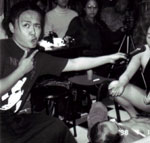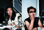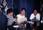 | 初公開後に映画を観たお客さんたちと『バトル・ロワイアル』を話し合おうと集まってくれた方々。故・深作欣二監督と健太監督が、サクさんが来るならと若松孝二監督も。そして司会を務めてくれた宮台真司さん。公開質問では退場者も出たエキサイティングなトークライブを、終止にこやかに笑っておられた深作監督が忘れられません。 |