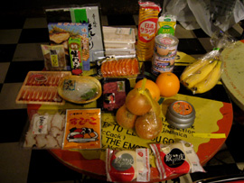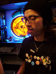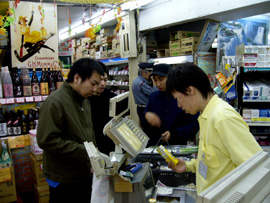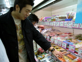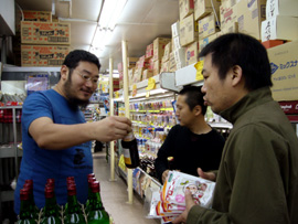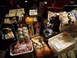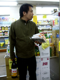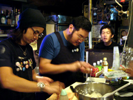 決戦会場であるロフトプラスワンに集合した後、さっそく買い出しを始めた彼ら。各バンド、作戦会議を立てながらスーパーにて模索中。バンアパ・チームは刺身や海苔やツナ缶やらの中に、何故かバナナとオレンジ味のするチーズを買い込んでました。そしてこれから料理を食すというのに原さんはケーキのデザートを買ってました(ちなみに料理対決の前にすぐに食べちゃってました)。そんなバンアパの割と原型に近い食品に対して、ブッチャーズ・チームは長ネギ、豆腐、エリンギ、ナス、卵、マロニーちゃん…と冬の定番を思い出させるような食品達。射守矢さんは「大根とかで風味を…まっ、でもそこまで凝ることはないのかなぁ?」って実に本格的です。吉村さんは「これに対して…これはこれくらいで…」と豆腐やマロニーちゃんやら、ひとつの鍋に対しての食品の比率をじっくりしっかり考えて選んでました。買い物かごはバンアパ2つ弱に対して、ブッチャーズは3つにいっぱい…買い込みすぎです(笑)。買い物を済ませ、対決会場へ向かう途中「ありゃ、鍋でもすんのかねぇ? パーティーかぁ?」って道行く人に言われてしまいました(笑)。いえいえ、我らはこれからのツアーへの意気込みを込めて「料理対決」を決行するのです!!