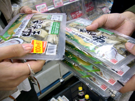 | ▲生がき100円引きにこだわるブッチャーズ・チーム。目黒嬢に値切るよう指令。 |