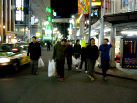 | ▲深夜の歌舞伎町を、レジ袋片手に歩む男達。 |