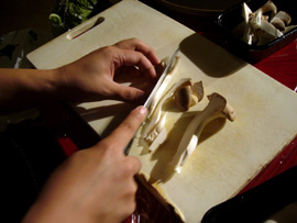 ▲まるで職人のように慣れた手つきでエリンギを切る吉村氏。 |