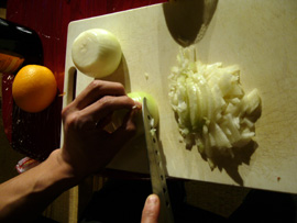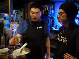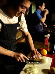 | ▲玉葱に泣かされながらもみじん切りを進める荒井氏。お隣り、吉村氏はホッピーで一休み。 |