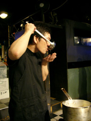 | ▲日本酒を片手に指示を出す射守矢氏。思わず荒井氏、木暮氏も手を止めて見学。 |