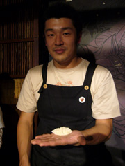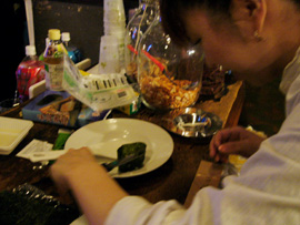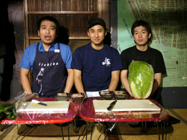 そして、個人的に今回私が終始目が離せなかったのは…バンアパ原氏、川崎氏による「手巻き寿司」。手につけて握る為だけにお酢を買い、本格派を目指す彼ら。最初は軍艦を作るものの、冷ましきってない御飯で海苔がふにゃけてしまうというハプニング。「御飯はもう少し冷ましたほうがいいねぇ」ということで、前にいた私は御飯を冷ます為パタパタと扇ぐ係に任命されました。そして握ることのほうに懸命になり、わさびを何度もつけ忘れる原氏。軍艦巻きの為に海苔を切る係にも任命された私。彼らは「握る」ということに一生懸命すぎちゃったのです(笑)。しかし、巻き終わって発覚! その海苔が思ったよりも高かったのです! すると川崎氏は「目黒、その高い部分をハサミで切って」…任命通り、私はもう御飯に巻かれたのに慎重にハサミで高さを低くしました。素人ならではの反則業です。その後も細かくハサミで微調整を繰り返し、見た目は最高です。「ちょっとこの海苔太いなぁ〜」と師匠にお指摘を受けながら頑張りました(笑)。そんなことを繰り返していったものの、30分もすると片手で御飯を握って微調整が出来るようになるという成長を遂げた彼ら。両氏、お互いに出来た寿司を「お前、上手いな〜」「お前も上手いよ!」と褒め狂いながら着々と握られていきました。厨房では小松さんが「+/−{PLUS/MINUS}丼」を炒め、射守矢さんは余った卵を厚焼き卵にし(2人共フライパンさばきが素敵!)、それを原氏、川崎氏のお寿司に加えるというコラボレート料理まで出来ました!
