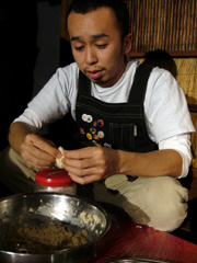 | ▲荒井氏が大きな手で器用に餃子の皮を閉じていきます。 |