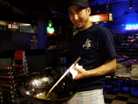 | ▲唯一自前のエプロンを持参の、+/−{PLUS/MINUS}丼の鍵を握る男。 |