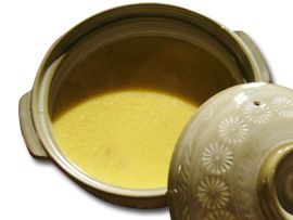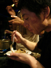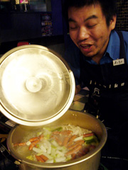 | ▲お鍋からのイイ匂いに思わずニヤける吉村氏。 |