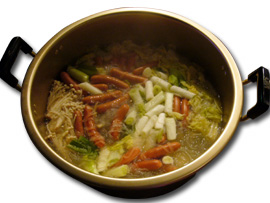 そして、我らがリーダー、ブッチャーズ吉村さんは鍋の準備万端! あとは火に掛けグツグツ煮込まれるのを待つのみ。昨年の冬に吉村さんがよく鍋をしていた話を聞いていて、私の中では幻の1品となっていたので楽しみです! 基本的にお肉は入っていないこの「ヘルシー鍋」、ポイントはソーセージだそうです。