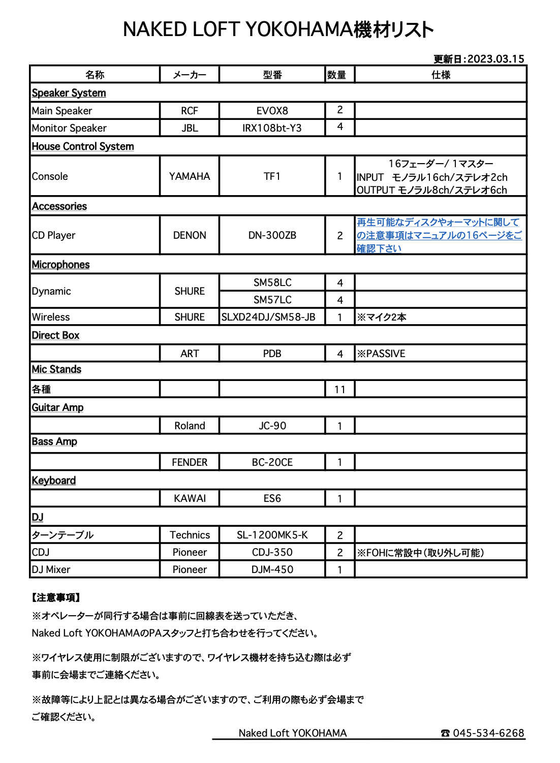 ※機材には多少の変動があります、仕様機材の確認は担当者へお問い合わせ下さい。