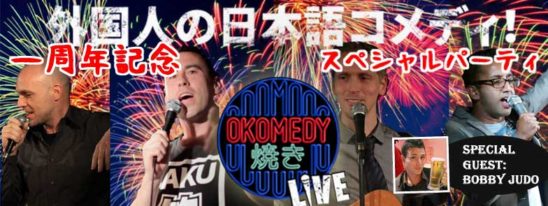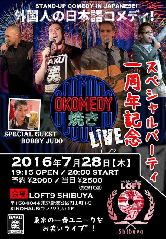 去年の今ごろ、東京の英語圏コメディアンたちは、グローバル化の風潮に吹き飛ばされ「郷に入れば郷に従え」のスピリッツで胸が一杯になり、日本語でコメディに挑戦する「おコメディ焼き!LIVE」2015年7月に第一弾を企画しました。レスポンスは「まあまあ」でしたが、我々は諦めませんでした。毎月毎月挑戦して、このようにユニークなお笑いライブにぴったりの新宿「NAKED LOFT」で毎月毎月ライブを披露して、どんどん成長を重ねました!その結果ついに、この国境を越える新鮮なお笑いの一周年にあたり、「渋谷LOFT9」(7月オープン予定)で特別一周年記念スペシャルパーティを開催することとなりました。