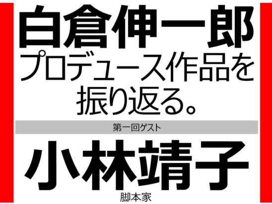 「仮面ライダーディケイド」までの平成仮面ライダーのテレビシリーズや、「超光戦士シャンゼリオン」などのプロデューサーを務めた東映の白倉伸一郎が、数々の東映作品に携わっている脚本家とグラスを片手にディープなトークを展開する。