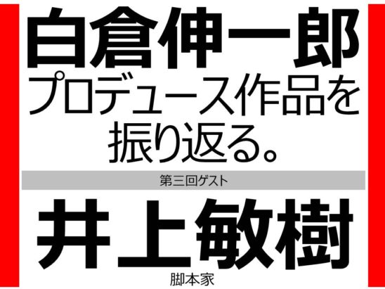平成仮面ライダーのテレビシリーズや、「超光戦士シャンゼリオン」などのプロデューサーを務めた東映の白倉伸一郎が、数々の東映作品に携わっている脚本家とグラスを片手にディープなトークを展開する。