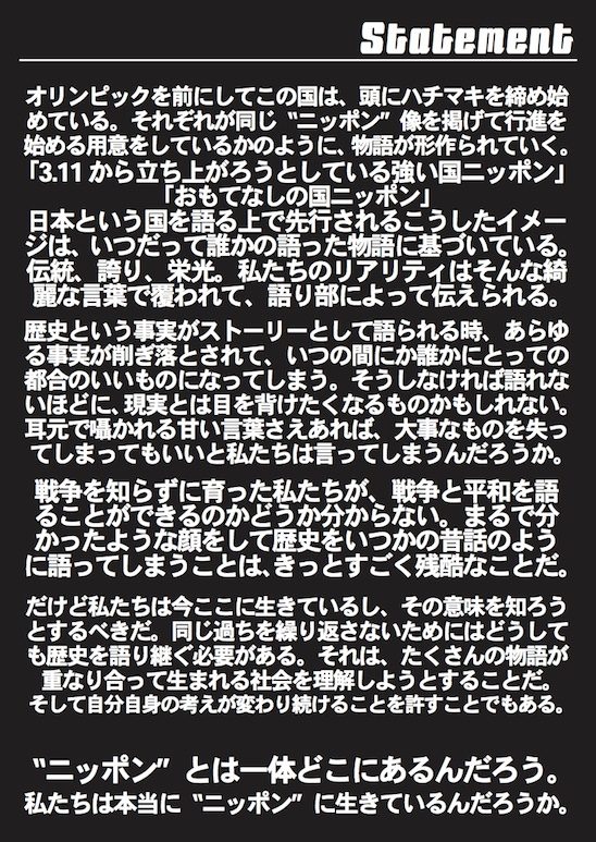 オリンピックを前にしてこの国は、頭にハチマキを締め始めている。それぞれが同じ“ニッポン”像を掲げて行進を始める用意をしているかのように、物語が形作られていく。「3.11から立ち上がろうとしている強い国ニッポン」「おもてなしの国ニッポン」日本という国を語る上で先行されるこうしたイメージは、いつだって誰かの語った物語に基づいている。伝統、誇り、栄光。私たちのリアリティはそんな綺麗な言葉で覆われて、語り部によって伝えられる。