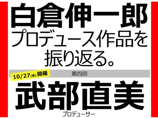 平成の仮面ライダーシリーズや、「超光戦士シャンゼリオン」などのプロデューサーを務めた東映の白倉伸一郎が、脚本家、監督、プロデューサーとグラスを片手にディープなトークを展開するイベント「白倉伸一郎プロデュース作品を振り返る」。第四回目決定! 長年一緒に作品を作ってきたプロデューサー同士の対談。乞うご期待。
