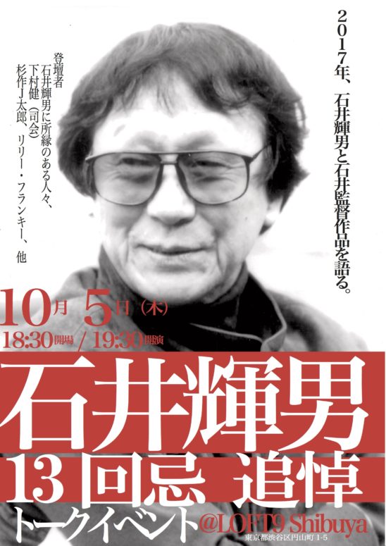 前半は、ゆかり深い関係者のレジェンド・トーク(19:30〜20:45)、後半(21:00〜22:00 最大22:30予定)は石井輝男を敬愛するリスペクト・トーク石井輝男の魅力を存分に感じるこの機会、ぜひご参加ください。