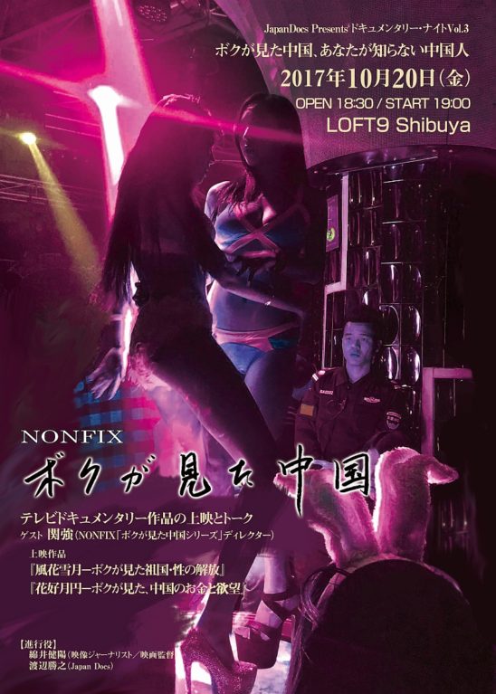 第3回目の「ドキュ・ナイト」は、フジテレビで20年以上続いている深夜の名物ドキュメンタリー番組「NONFIX」で、異例のシリーズ放送(これまでに3回、9月12日深夜に4回目が放送)が続いている「ボクが見た中国」のディレクター・関強(かん・きょう)さんをお招きします。