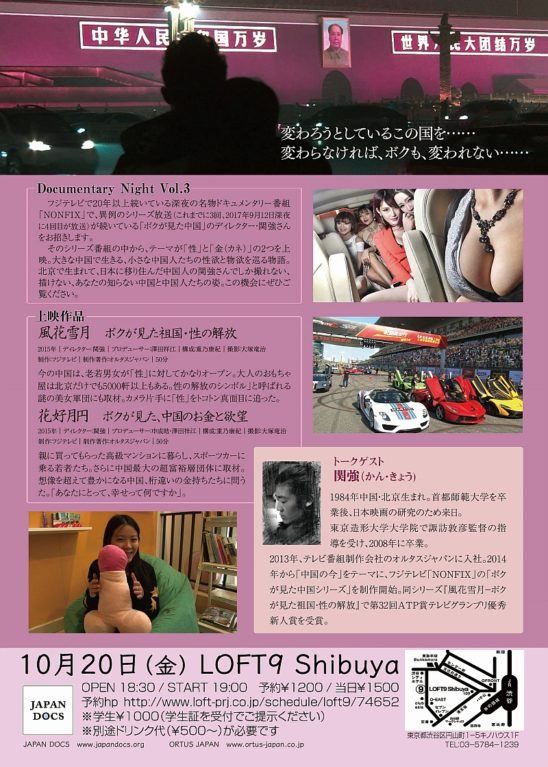 そのシリーズ番組の中から、テーマが「性」と「金(カネ)」の2つを上映。大きな中国で生きる、小さな中国人たちの性欲と物欲を巡る物語。北京で生まれて、日本に移り住んだ中国人の関強さんでしか撮れない、描けない、あなたの知らない中国と中国人たちの姿。この機会にぜひご覧ください。
