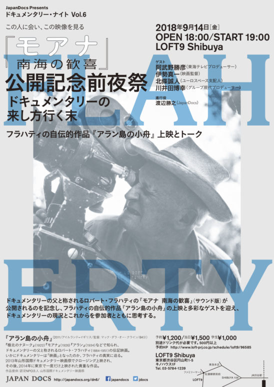 ドキュメンタリーの父と称されるロバート・フラハティの『モアナ 南海の歓喜』(サウンド版)が9月15日(土)から岩波ホールで公開されるのを記念し、フラハティの自伝的作品『アラン島の小舟』の上映と多彩なゲストを迎え、ドキュメンタリーの現況とこれからを参加者とともに思考する。