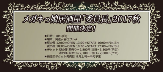 SCHEDULE 2017 10 01 Sunday メガネっ娘居酒屋「委員長」2017秋<夜の部> OPEN 18:00 - START 19:00 Tweet 【出演】 CutiePai まゆちゃん(司会):めがねアイドル 磨伸映一郎:マンガ家 藤井三打:ライター はいぼく:眼鏡っ娘研究者 いつものように(?)、ディープな眼鏡談義を繰り広げます。 アメコミに描かれた眼鏡、眼鏡哲学、鯖江めがねフェスティバル報告(予定)など、例の如く。 同志たちと共に眼鏡道に邁進していきましょう! TICKET前売¥2,100(飲食代別) / 当日なし 前売は9/9(土) 12:00よりe+にて発売! ※前売Sold Out!! 当日券の販売はございません。 Share