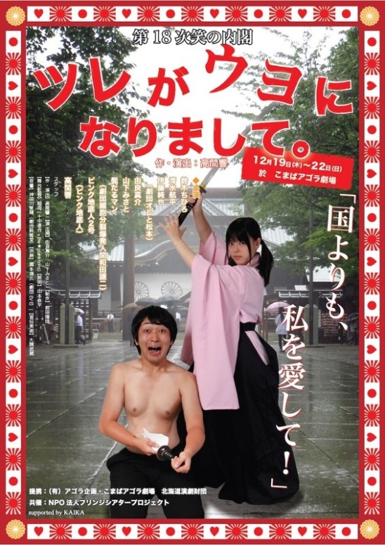 2012年に初演、今年初頭に全国3カ所で再演された、時事ネタコメディ劇団笑の内閣がおくる、愛国恋愛コメディ『ツレがウヨになりまして』、演劇ファンのみならず、多くのカウンターをよび、ネトウヨからは攻撃された作品が東京で初上映。