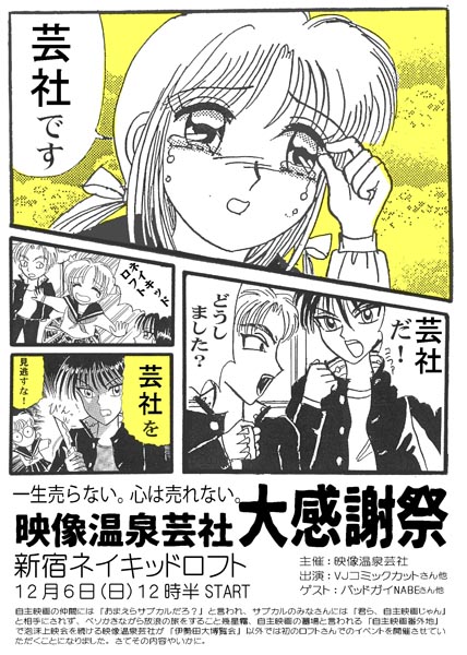 ベソかきながら放浪の旅をすること幾星霜。自主映画の墓場と言われる「自主映画番外地」で泡沫上映会を続ける映像温泉芸社が